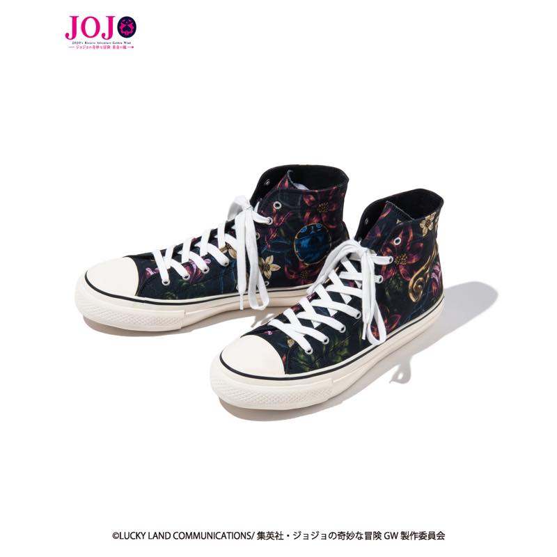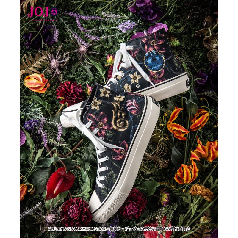 リエイターに支持され、原作コミックスはシリーズ累計発行部数1 億冊を突破している”ジョジョの奇妙な冒険”。5月15日発売となったスニーカーでは登場人物たちが胸に抱く“気高き『覚悟』”をテーマに、主人公ジョルノ・ジョバァーナをモチーフにしたオリジナルの植物柄をあしらった一足に。